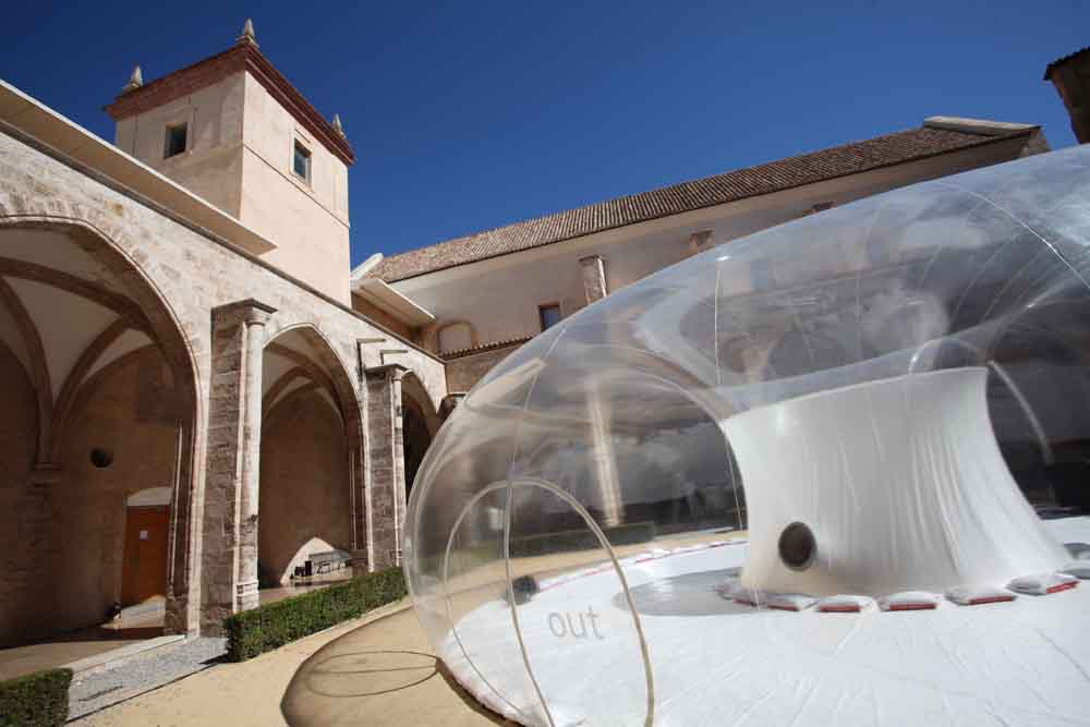 La sala neumática ‘Medusa’ fue creada ex profeso para instalarse en el claustro gótico del Centre del Carme Cultura Contemporània de València con motivo del Festival 10 Sentidos que se celebró en mayo de 2018. Debido a la buena acogida de la instalación, la dirección del Consorci de Museus de la Comunitat Valenciana, cumpliendo con su misión de vertebrar y difundir la cultura en todo el territorio de la Comunidad Valenciana ha decidido mostrarla ahora en Alicante. En esta ocasión, la cita aúna otra propuesta del Consorci de Museus, como es el Festival de exploración Audio & visual Volumens, que pretende ser una experiencia sensorial donde los sentidos de la vista y el oído se complementan, confunden, reaccionan, interaccionan y crean un lenguaje único.