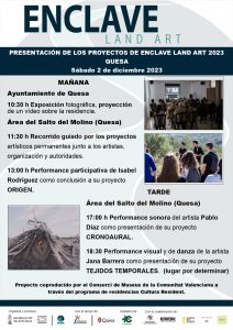 A les 10:30 hores. Inauguració de l’exposició fotogràfica que presenta els set projectes de la quinta edició d’Enclave Land Art. Lloc: Sala d’actes de l’Ajuntament de Quesa.