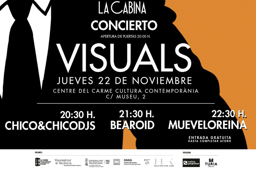 La Sección Visuals pone el punto musical con una jornada en la que tres bandas valencianas ofrecerán un concierto el jueves 22 de noviembre en el claustro del Centre Carme Cultura Contemporània, gracias a la colaboración del Consorci de Museus de la Comunitat Valenciana. Bearoid, Mueveloreina y #chicoychicodjs, que incorporan visuales en sus actuaciones, serán los grupos protagonistas de una noche en la que se sumará la potencia de la imagen con la música en directo.