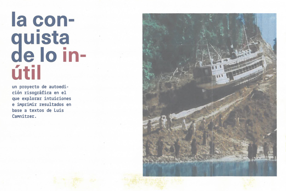 ‘La conquista de lo inútil’ es un proyecto de autoedición risográfica desarrollado por el alumnado del máster Permea junto con el estudio editorial per(r)ucho situado barrio del Carmen. En él, exploran intuiciones e imprimen resultados tomando como punto de partida los textos e ideas que Luis Camnitzer plantea en su nueva publicación ‘in_utilidad: el arte como educación’ y que han materializado a partir de distintas premisas y aproximaciones metodológicas a la conquista de lo inútil: