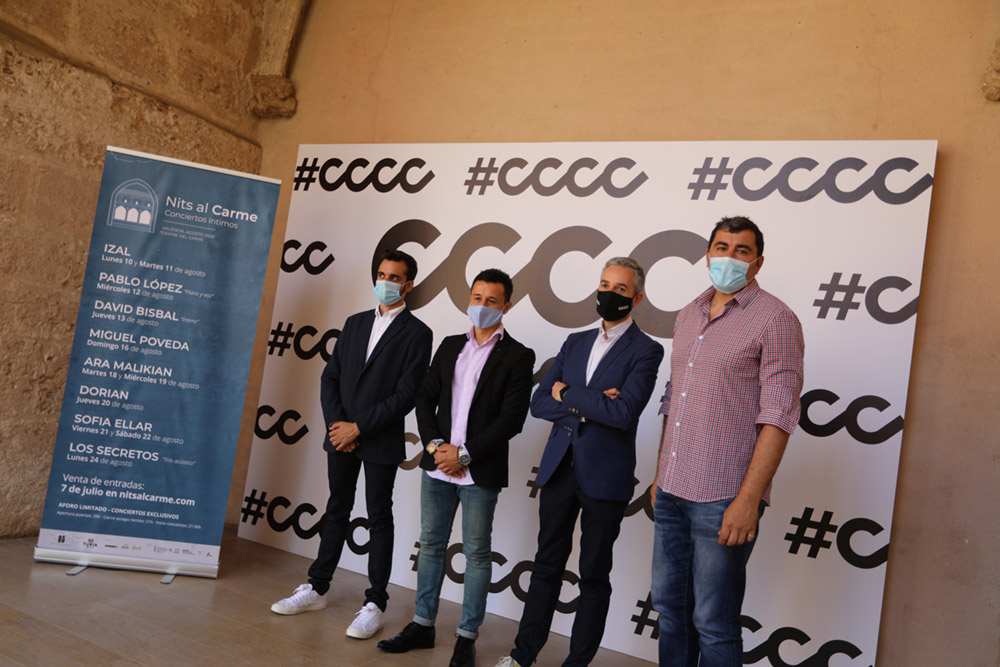 València (02.07.20). El director del Centre del Carme, José Luis Pérez Pont, junto a los portavoces de la promotora valenciana BS Entertainment, Miguel Torres y Juanjo Talavan y Daniel Arnal, técnico de Turisme Comunitat Valenciana, ha presentado el ciclo de conciertos ‘Nits al Carme’, que contará con Ara Malikian, David Bisbal, IZAL, Pablo López, Miguel Poveda, Dorian, Sofía Ellar, quién también ha estado en la presentación vía telemática y Los Secretos en su primera edición.
